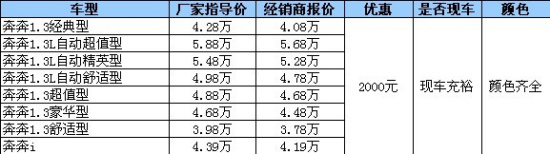 新浪汽车讯:在春节即将来临之际,编辑从北京燕长风总店获悉,奔奔目前店内现车和颜色都充足,且全系优惠2000元,到店谈还能争取更多优惠。