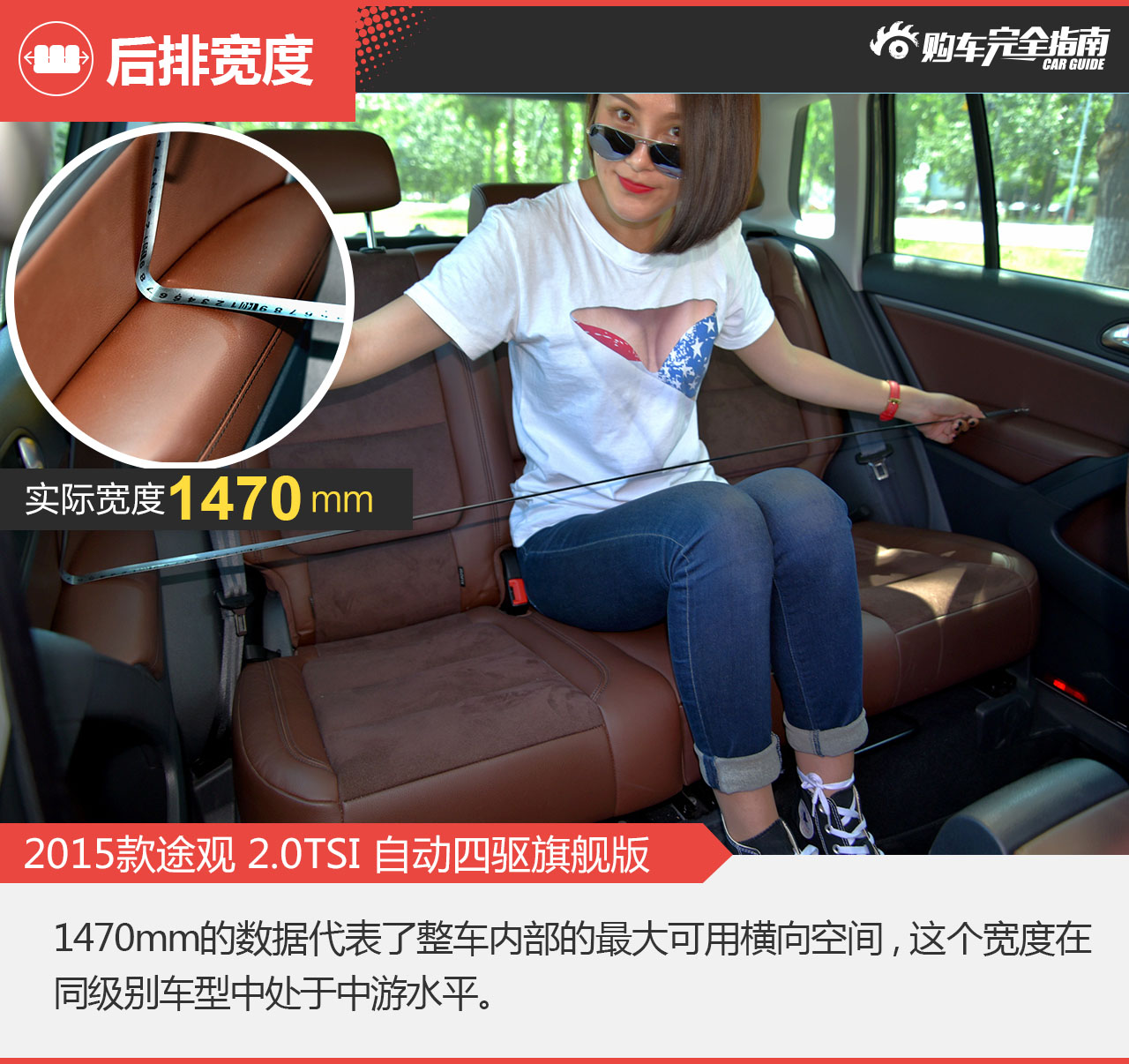 测试方法:保证前排座椅不做任何调整,模特在后排用手比量腿部剩余空间,用尺子度量前排座椅靠背后方至腿部的垂直距离。