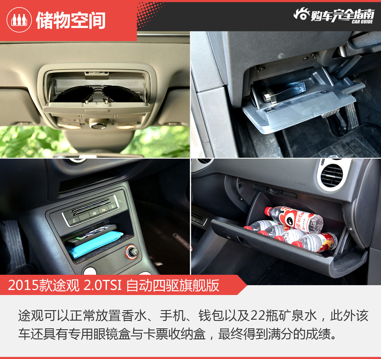 途观的储物空间非常可观,而且前后排均有照顾。除了前排硕大的副驾驶手套箱之外,每个车门内侧还能还能容纳5瓶矿泉水。后排门板可容纳3瓶矿泉水,中央出风口下方还有个能放进烟盒的储物槽,照顾还是挺周到的。