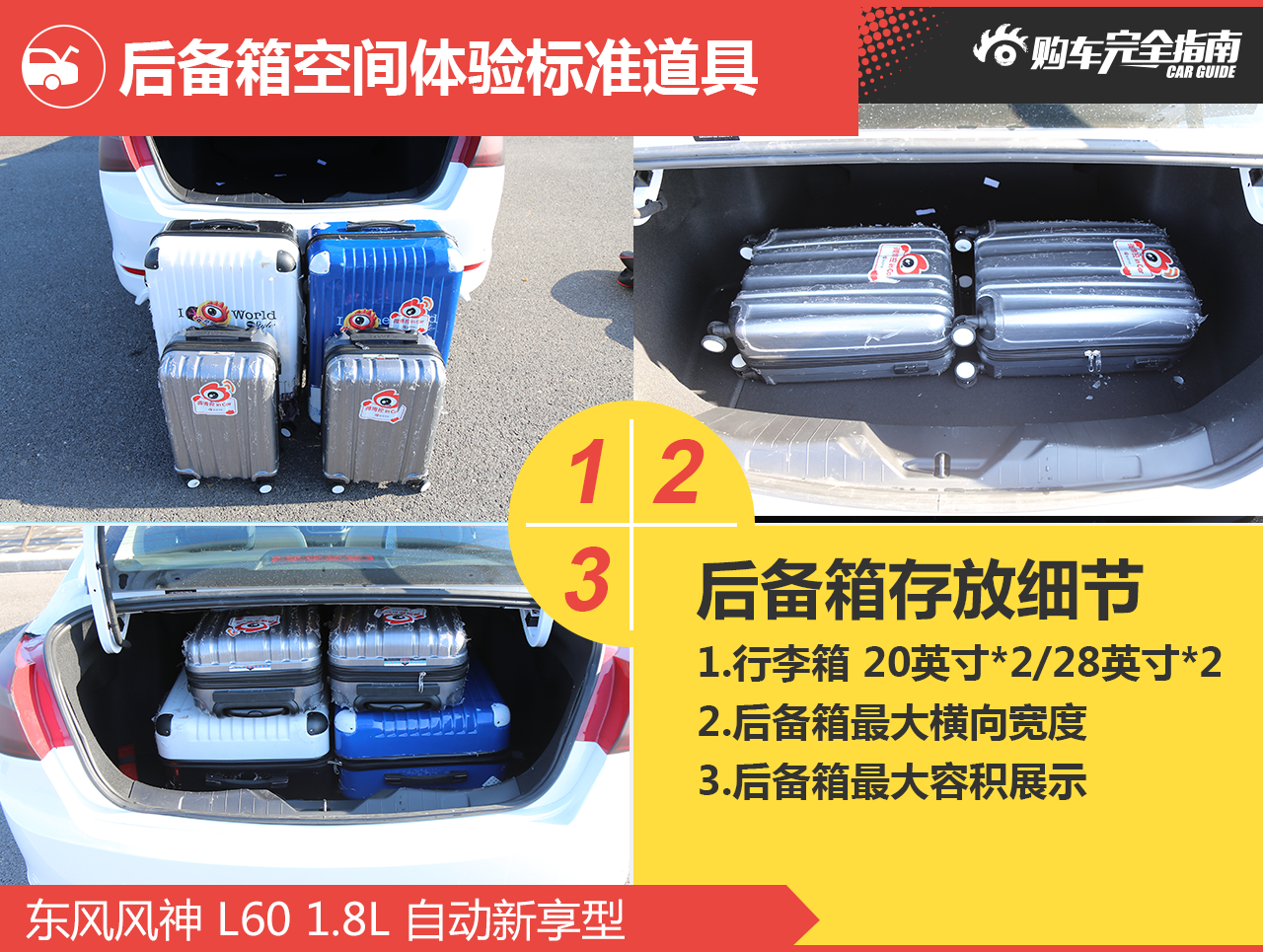 东风风神L60的后备箱一共能够放下两个28寸旅行箱和两个20寸旅行箱,在该级别车型中表现中规中矩,至少日常出行已经基本够用了。