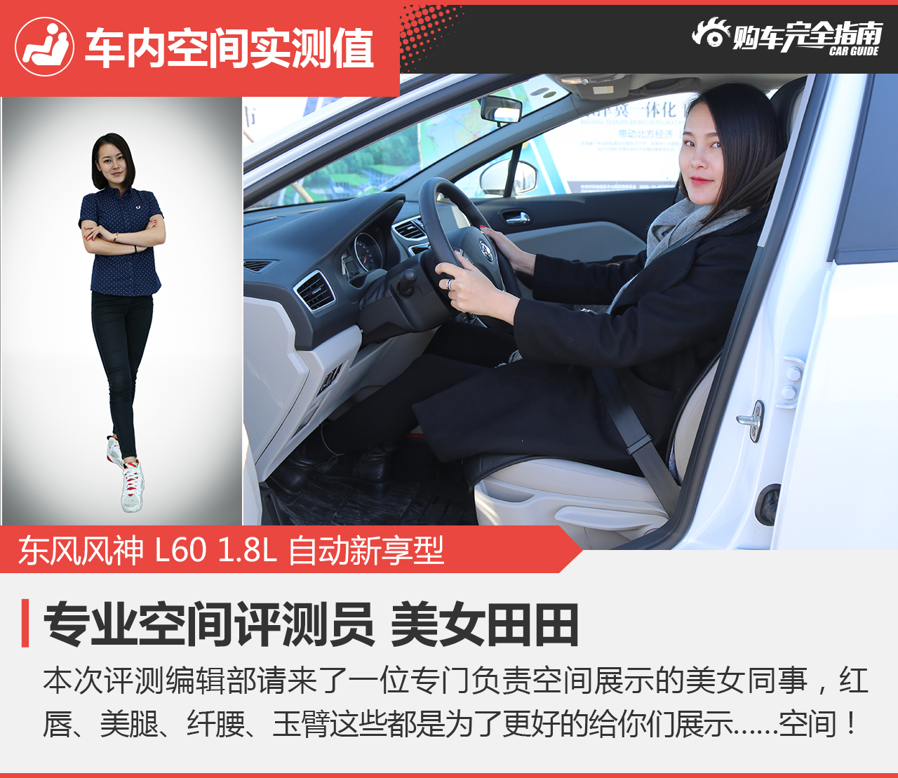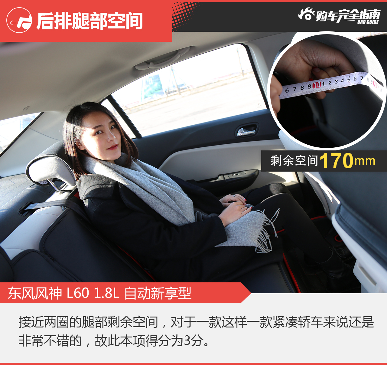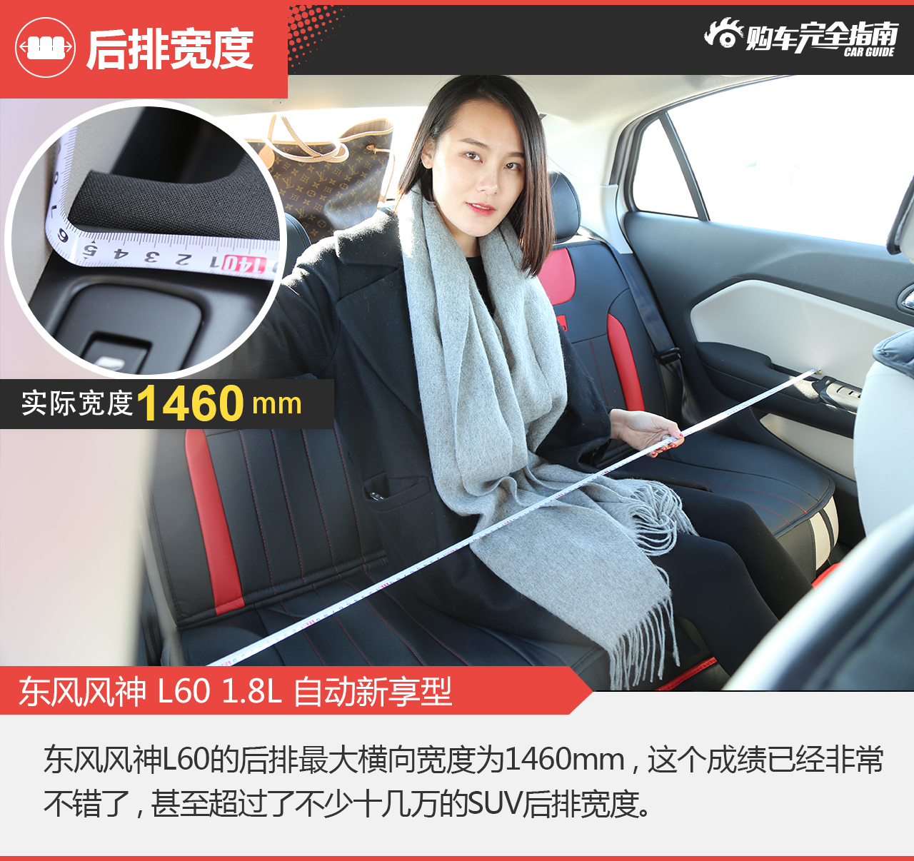 后排宽度同样获得了3分的成绩,1460mm算是正常水平,田田称L60后排座椅舒适性还好,就算横过来大长腿也能放得下!