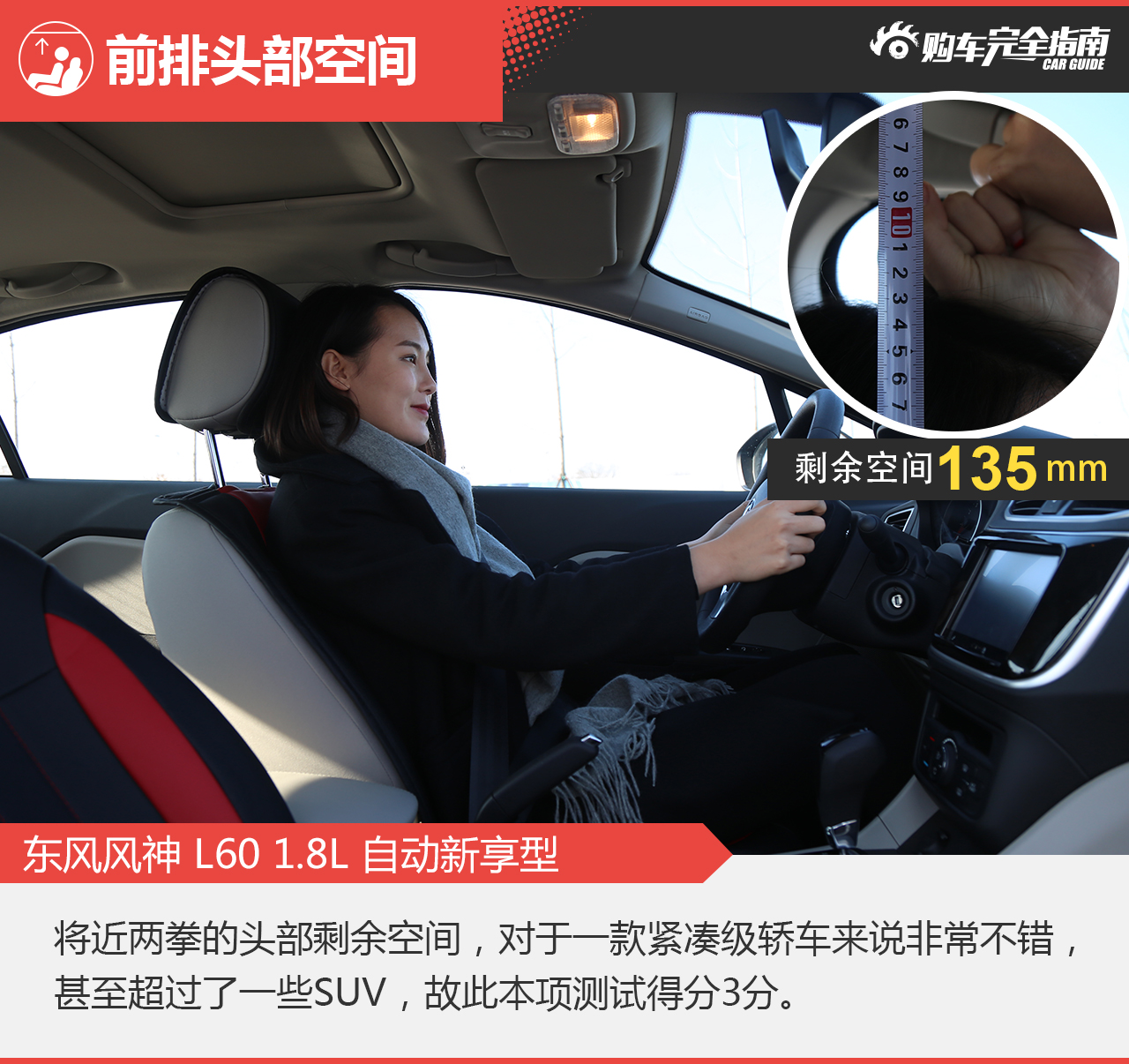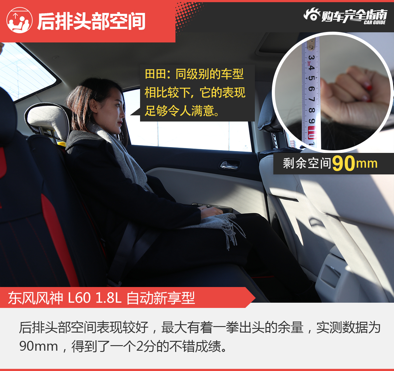测试方法:保证前排座椅不做任何调整,模特在后排用手比量头部剩余空间,用尺子度量车顶至头部垂直距离。