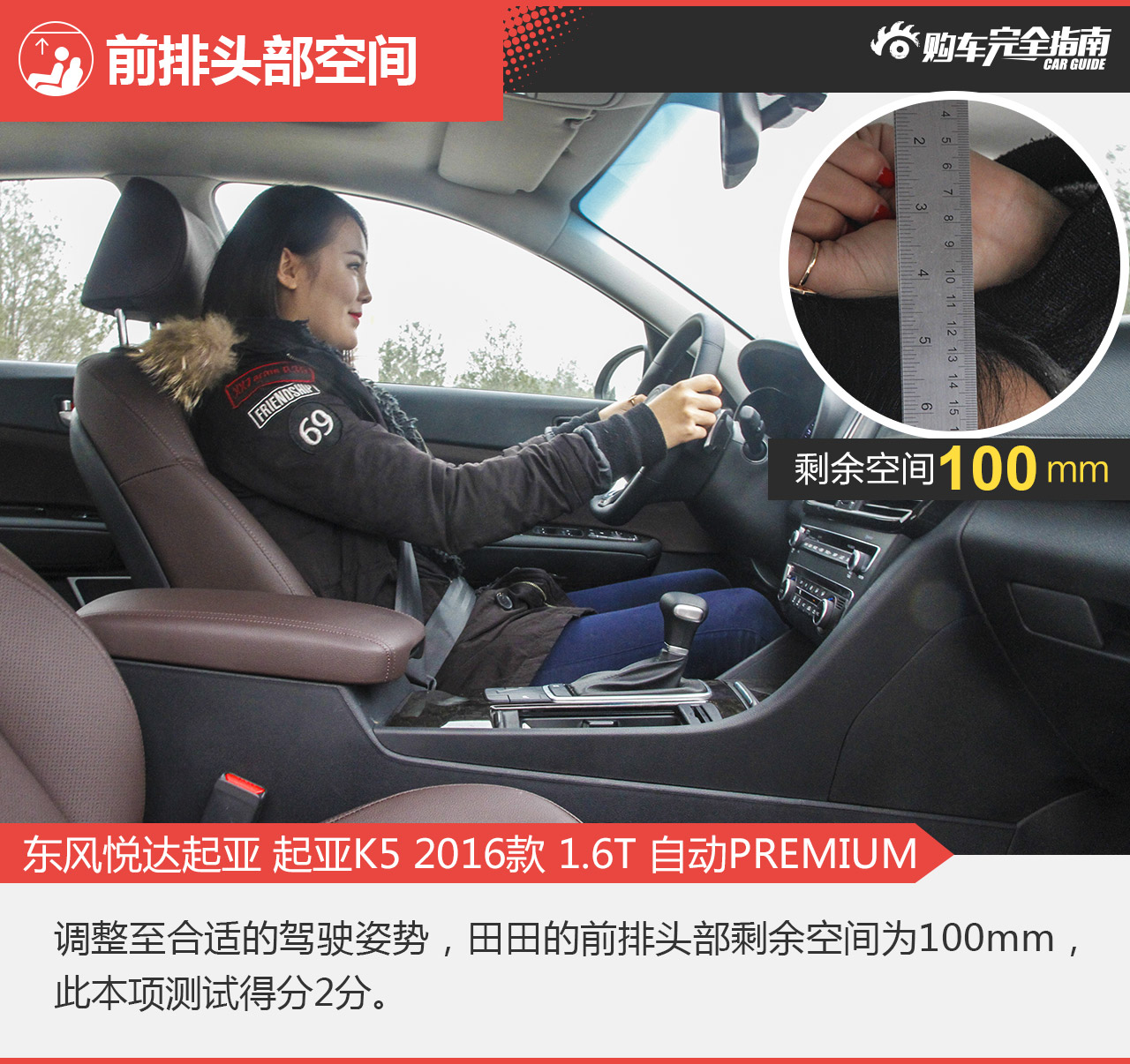测试方法:保证前排座椅不做任何调整,模特在后排用手比量头部剩余空间,用尺子度量车顶至头部垂直距离。