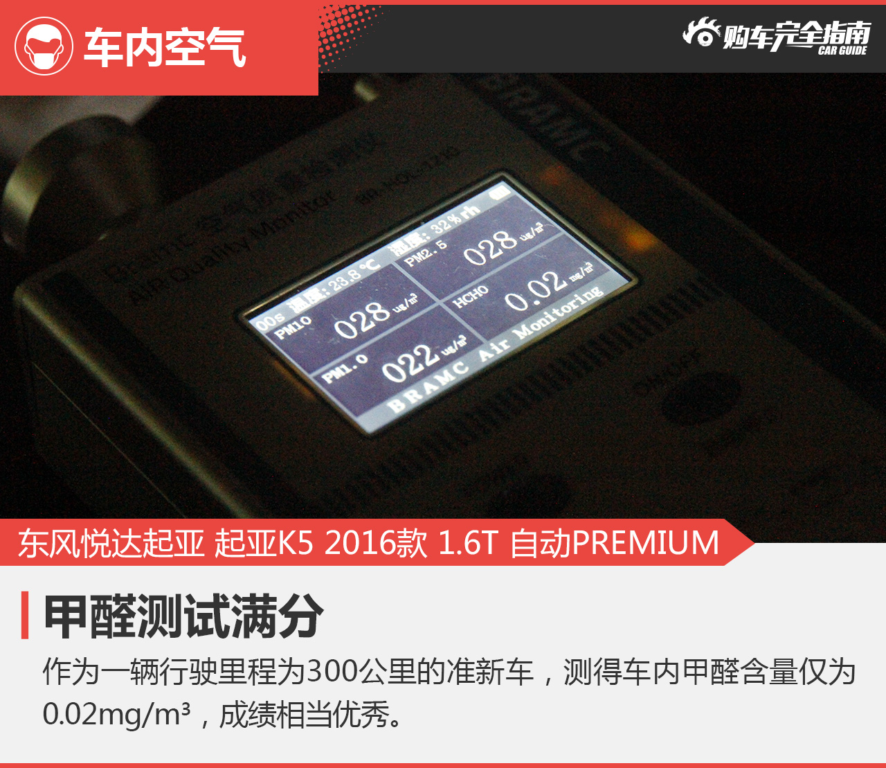 >0.15 mg/m³(0分) - 车内实测甲醛含量为0.02mg/m3
