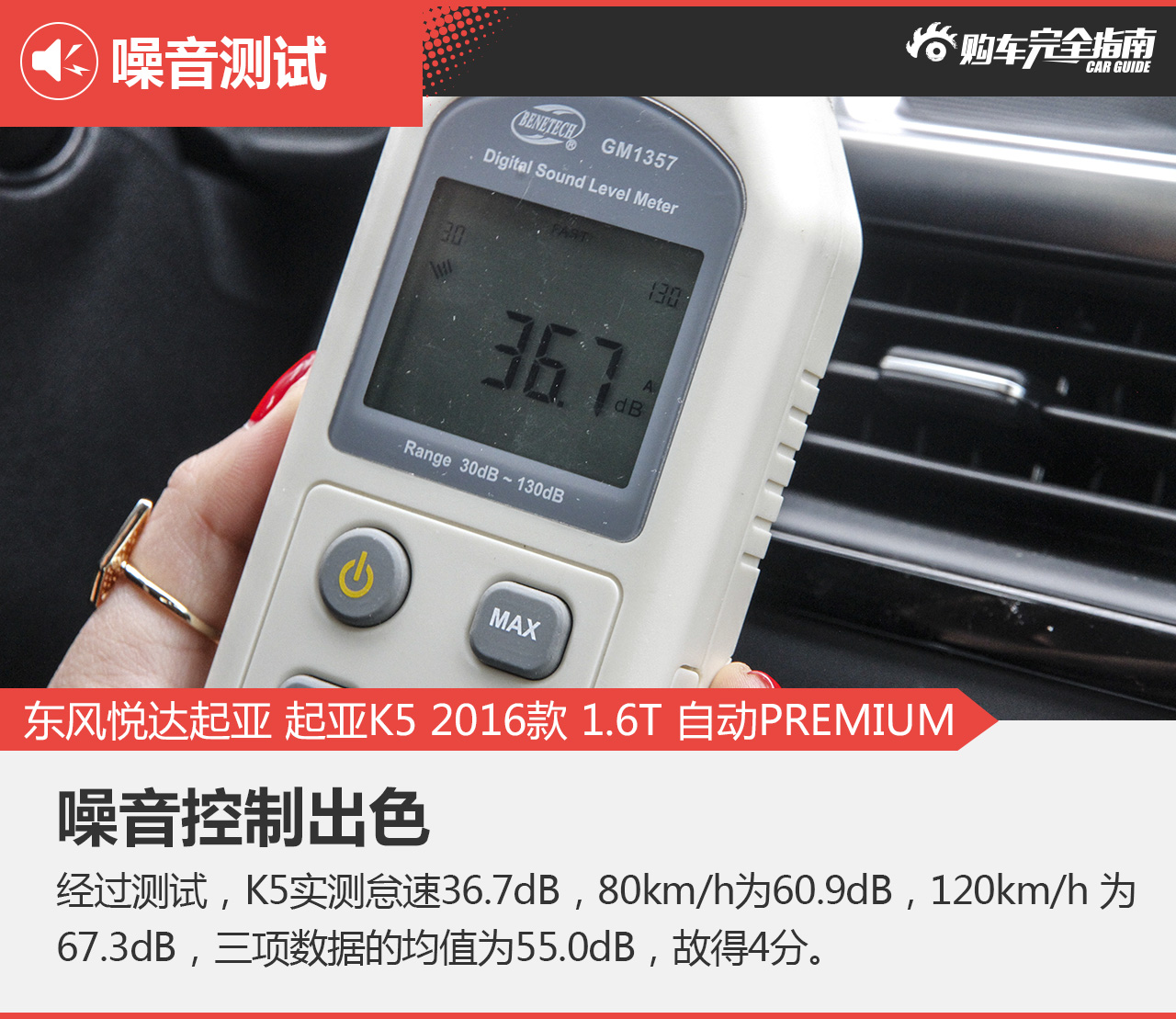 测试条件:车窗保持关闭状态,周围环境没有过大噪音,路段开阔或专业测试场地中,空调风扇与音响均处于关闭状态下。