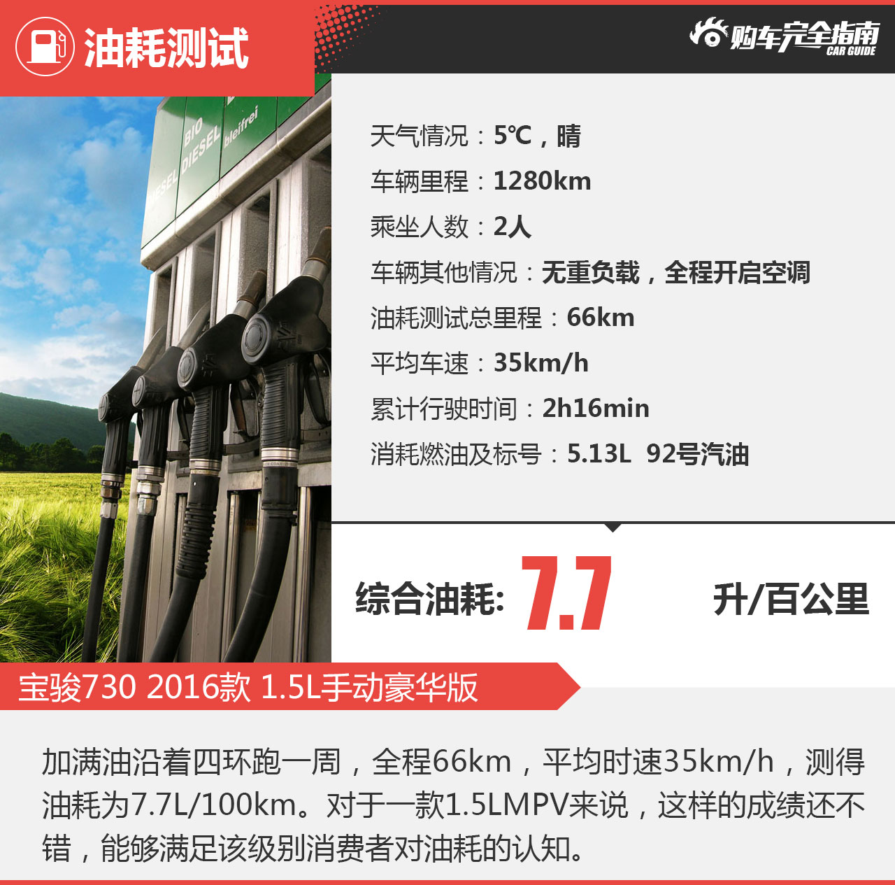 这两天跑下来,看着油表的显示,基本在7L左右浮动。经过实际测试,最终得出这台1.5L手动档宝骏730百公里油耗为7.7L。是个不错的成绩,可别忘了它的自重本就很大。