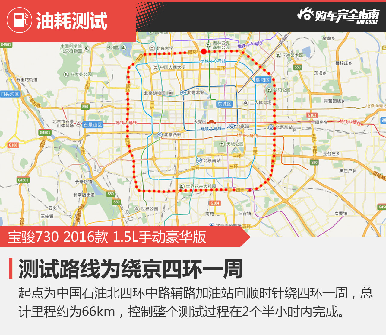 3.沿四环内环路行驶,对应车辆多功能显示器将平均车速保持在35km/h左右,如主路畅通可沿辅路行驶。如没有多功能显示器,则控制整个测试时间在3小时完成。