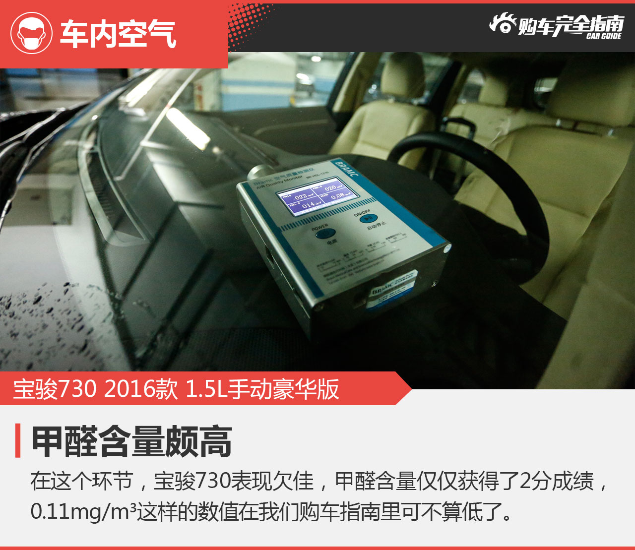 >0.15 mg/m³(0分) - 车内实测甲醛含量为0.11mg/m3