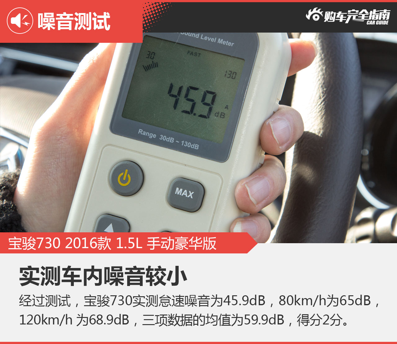 测试条件:车窗保持关闭状态,周围环境没有过大噪音,路段开阔或专业测试场地中,空调风扇与音响均处于关闭状态下。