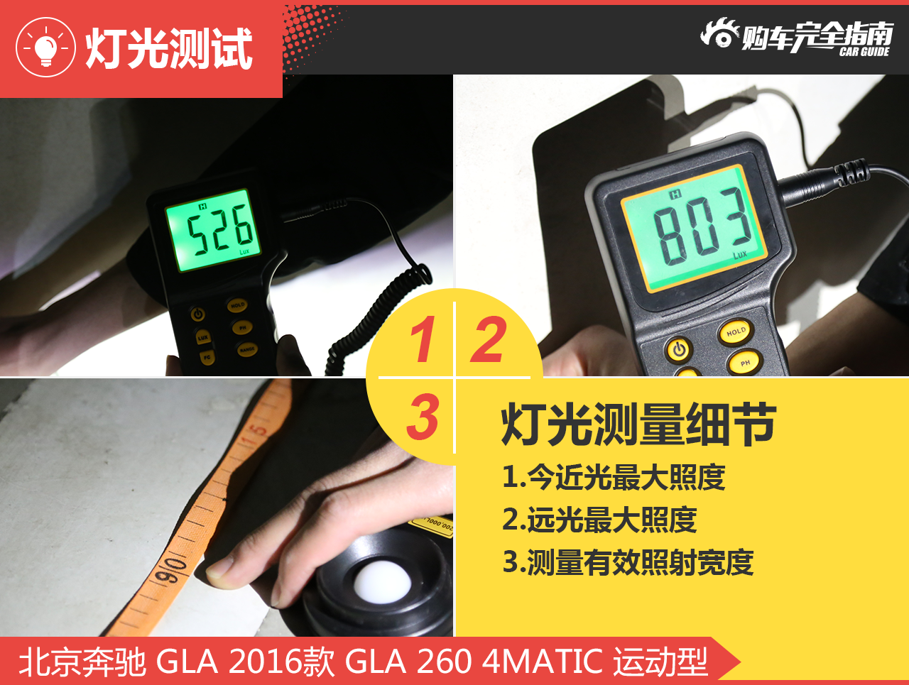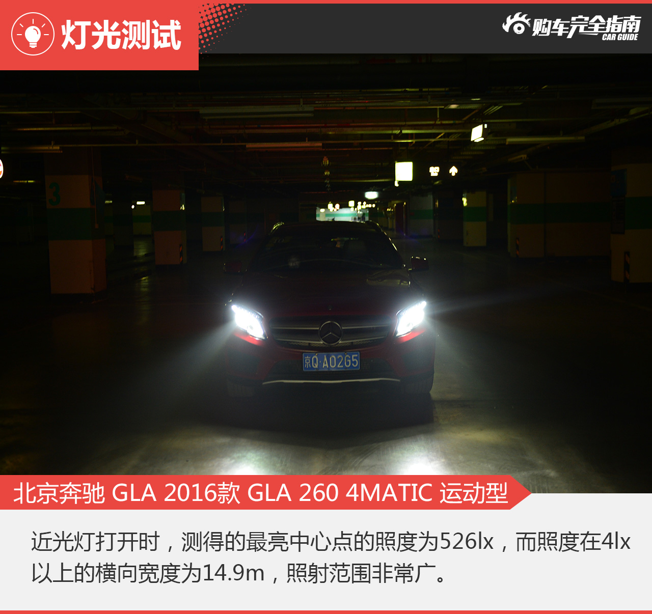 GLA的近光灯最大照度526lx,获得了4分的成绩,由于近光灯采用LED光源,因此可以获得0.5的加分,最终获得4.5分。此外,GLA的灯管均为氙气光源,远光最大照度为8.3lx,数值可谓惊人,而近光灯的有效照射宽度更是达到了14.9m,夜晚在户外行驶时可以获得非常不错的视野。
