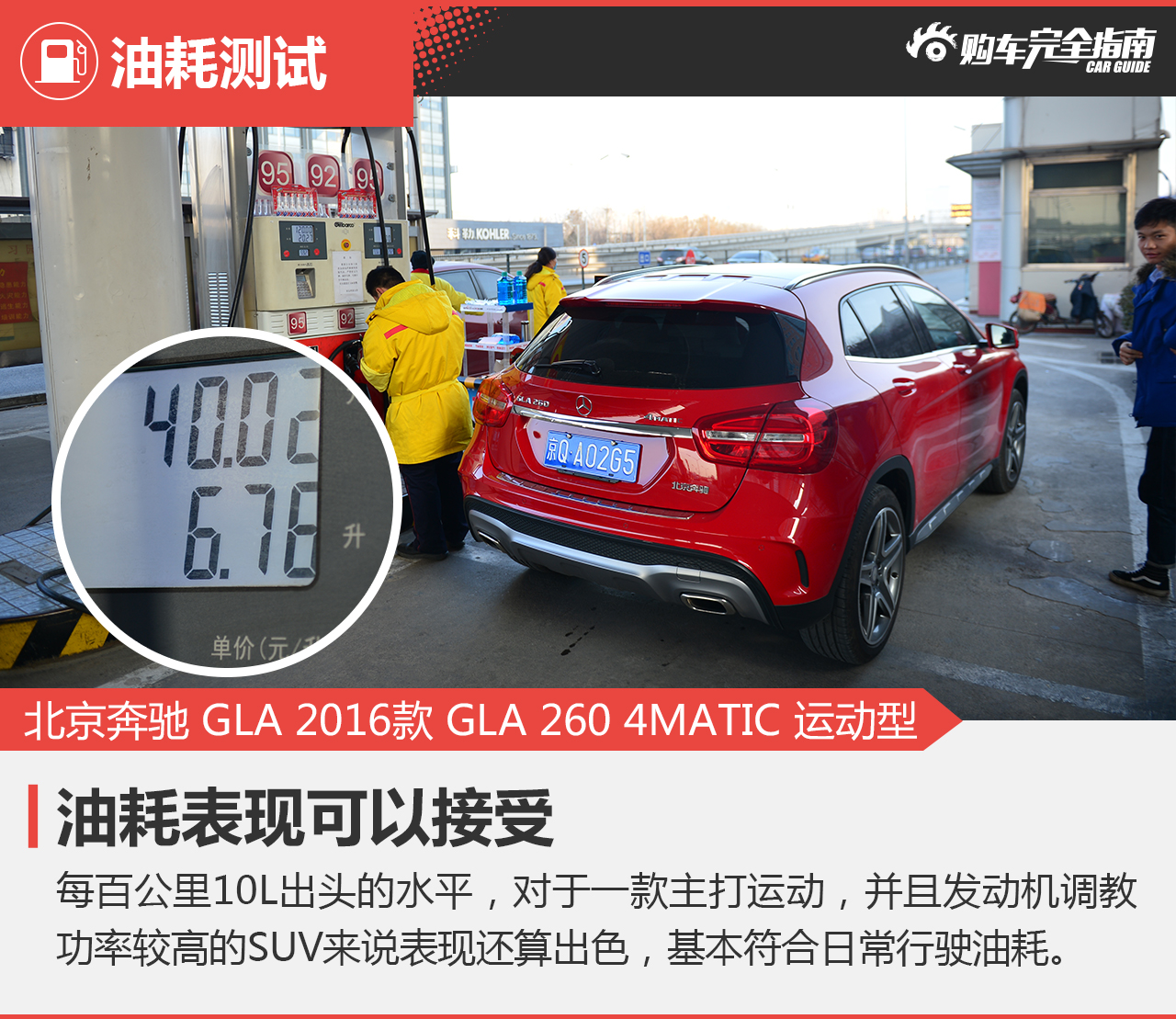 由于使用了高功率版本的2.0T发动机,所以在测试前我并没有对GLA的油耗有什么期盼,而且北京的拥堵也是有目共睹的。但是整个测试结束后,10升出头的油耗成绩让我还是吃了一惊,这个成绩让我能够接受,而且说表现还算不错,要知道你拥有的可是非常强劲的动力啊。