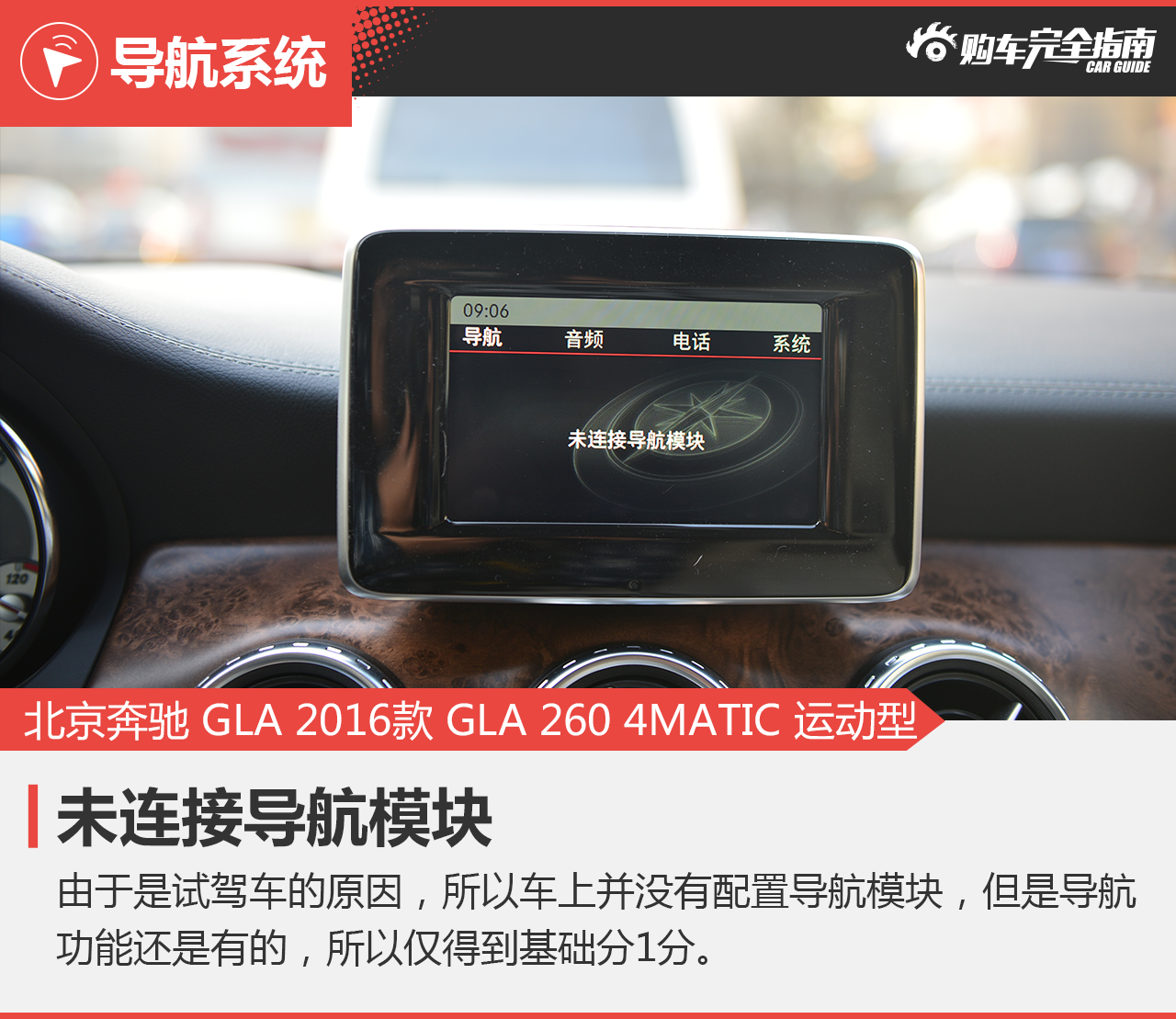 GLA的屏幕尺寸略小,只有5寸出头,所以基础分得到2分,但是它的多媒体系统可以通过旋钮控制,并且方便实用,所以特殊项得到0.5分加分,共计2.5分。