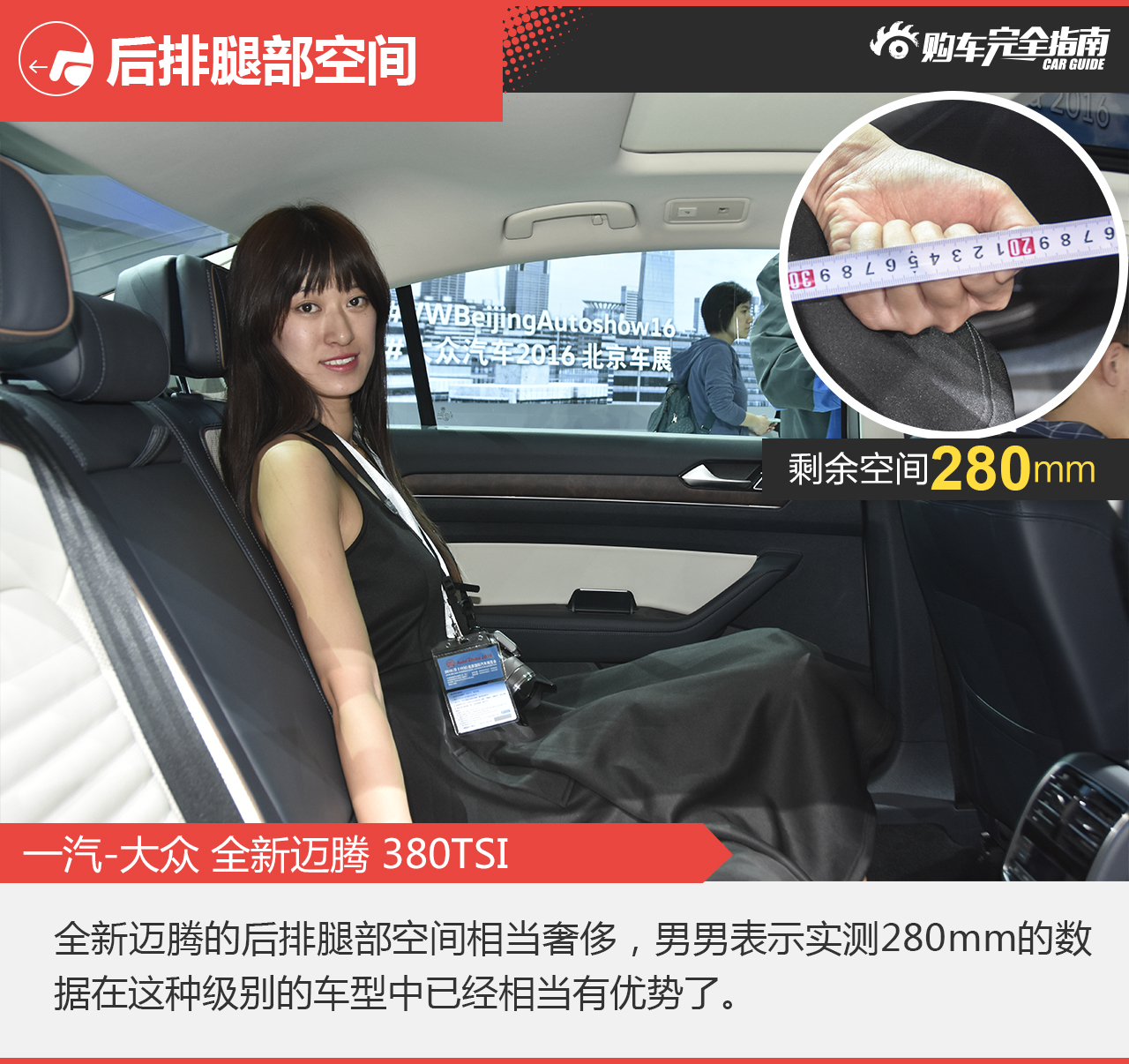 测试方法:保证前排座椅不做任何调整,模特在后排用手比量腿部剩余空间,用尺子度量前排座椅靠背后方至腿部的垂直距离。