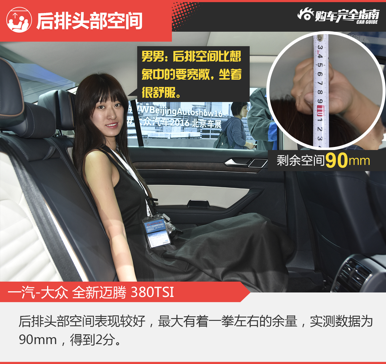 测试方法:保证前排座椅不做任何调整,模特在后排用手比量头部剩余空间,用尺子度量车顶至头部垂直距离。