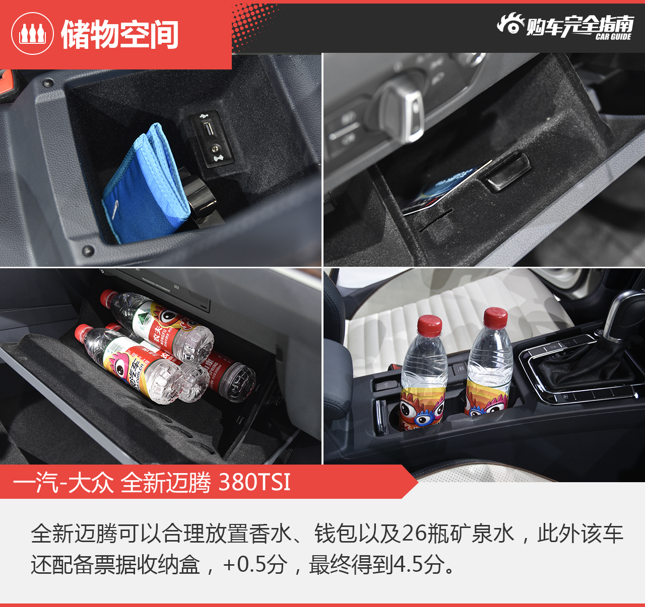 经过测试,全新迈腾车内可以正常放置香水、钱包以及26瓶矿泉水,属于4分的水准。不过由于配备票据收纳盒,得到0.5分的加分,总分4.5分。