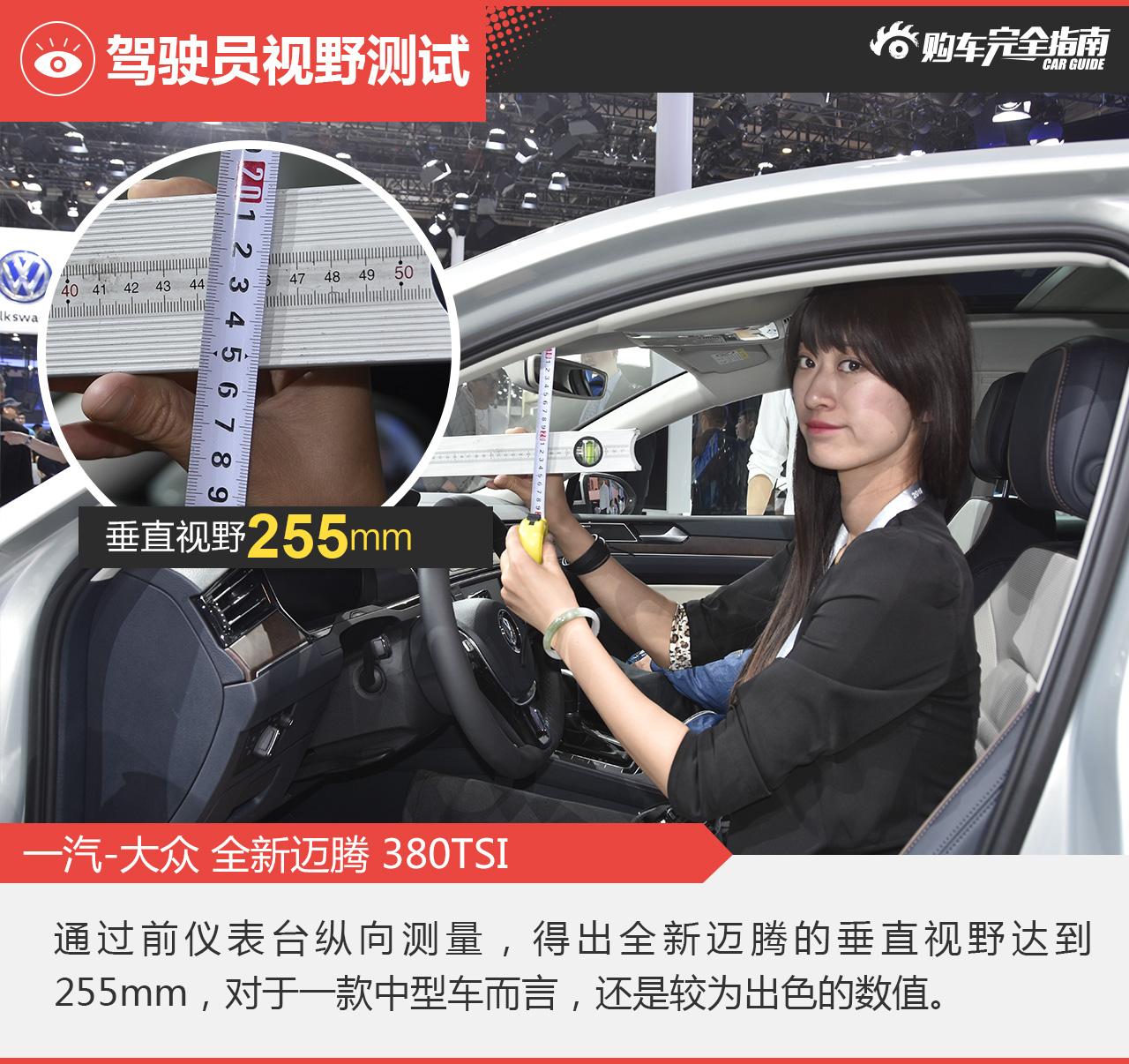由于可调方向盘的位置根据田田自身需求进行的调整,所以在进行测试时是属于相对固定的,而测量视野时需要根据仪表盘与方向盘组成的平面来设定水平高度,所 以这里的数据与最终的成绩是具有横比性的。此次全新迈腾的视野垂直范围达到了260mm,拿到了同级中较为不错的成绩,值得肯定。