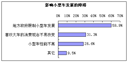 调查结果显示,59.9%的消费者认为,中央发展小型车的政策并没有落到实处是小型车发展的最大阻碍。相关资料显示,为缓解交通压力,排量在1.0升以下的小车成为限行的主要对象,而在一些大城市,排量1.2升以下的小车也禁止进入繁华地带。按照国际上的通行规则,车道按速度划分,车辆按不同时速分道行驶,只要能达到规定的速度,不同的车型都可以随意行驶,加之小型车占用的道路面积比中高档轿车小很多,提倡小型车反而会在一定程度上缓解交通压力。