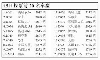 与14日投票结果有所不同的是,宝来与标致307亚军与季军位置对调。新奥迪A4由14日第六位上升至15日第四位。QQ晋级也十分明显,由14日的12位升至第7位。