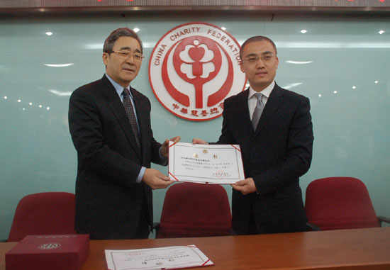 中华慈善总会为北京燕宝汽车服务有限公司颁发捐款证书(左:中华慈善总会会长范宝俊 右:北京燕宝汽车服务有限公司 销售总监贾若冰)