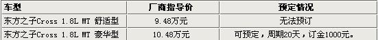 另据记者从北京地区的奇瑞4S店了解到,东方之子Cross 1.8L已经可以接受预订,订金仅需1000元,大概20天左右就可以提到现车。但据4S店销售人员介绍,东方之子Cross 1.8L目前只有豪华型接受预订,另一款舒适型由于产能方面的原因,预订周期会比较慢,所以暂不接受预订。