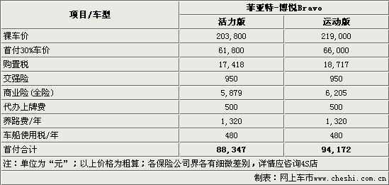 2008年8月21日菲亚特重新进入了中国市场,并一口气推出了三款全新的进口车型,博悦(Bravo)、领雅(Linea)和朋多(Grande Punto)。其中两厢轿车博悦(Bravo)是一款以运动著称的车型,拥有1.4T涡轮增压发动机,最高时速高达212Km/h,百公里加速也仅为8.5秒。售价在20.38-21.9万元之间。那么对于想要购买该车的朋友来说,分期贷款或全款购车到底要花费多少才能把它开回家呢?通过下面的详实解析,让我们一同了解实际购买过程中的具体花费。