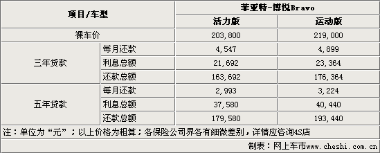贷款购车不仅可以提前享受有车的乐趣,而且也可以合理周转现有资金。目前由于菲亚特汽车暂时没有自己的金融机构,贷款购车只能通过银行系统。以售价20.38万元的博悦(Bravo)活力版的银行按揭为例,您最高可以享受到70%、3年的按揭(公务员、教师可达5年),这样的话购买该车的首付加上相应的购置税、保险等费用总计大致在8.83万元左右。