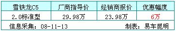 【易车网昆明讯】全球金融风暴,危机越来越广,汽车企业也不能幸免。近日,笔者从云南合兴了解到,目前雪铁龙进口C5有大幅优惠,具体如下表:
