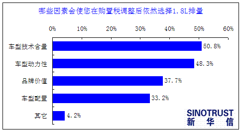 是哪些因素使消费者在购置税调整后依然选择1.8L及以上排量车型呢?从调查结果来看,消费者的选择比较分散,车型的技术含量、动力性能、品牌价值等都成为他们不选择1.6L及以下排量车型的原因。