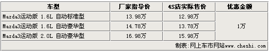 马自达3两厢是一汽马自达以进口方式引入的运动车型,这款车凭借着出色的动力性能赢得了广大消费者的亲睐。但随着新款两厢马3的即将引入,目前销售的老款车型价格也出现了较大松动。据网上车市网站价格监测系统显示:消费者在北京地区的一汽马自达4S店购买马自达3两厢车型,可以享受到10000元的现金优惠。具体车型见下表: