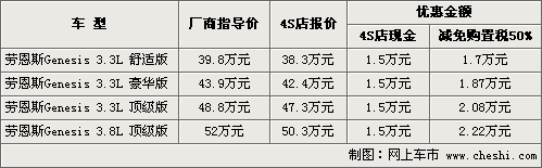 现代进口劳恩斯自去年9月上市以来价格一直没有太大幅度的优惠和活动推出,但在3月份劳恩斯推出了购置税减免50%的大型活动,而截至日期是本月底。根据网上车市价格监测系统显示,目前购买这款车的用户除了享受购置税5折优惠,还可享受4S店内1.5万元的现金优惠,具体车型以及价格如下: