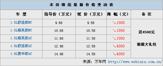 近日笔者从广州本田经销商了解到,去年上市新车——锋范的价格终于有所松动,全车系最高让利达到4000元,经销商并赠送价值不菲的保险装潢大礼包,详情请见下表: