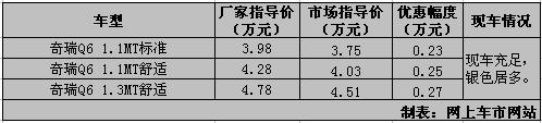 作为一款小三厢,又经济实惠的QQ6,近日,据记者从深圳4S店了解到,有一定幅度的优惠,全系最高优惠两千七。如想购买该车的朋友可联系:0755-33002601、13760188397(赵先生)。具体详情请看下表: