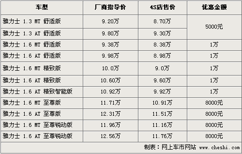 据4S店销售人员介绍,目前雅力士全系车型有黑色、紫色等现车供应。因为车型较多,现车主要集中在1.3、1.6舒适版手动和自动挡车型上,其余高配车型均需要预订。现金优惠方面1.3排量两款车可以优惠现金5000元,1.6精致版优惠则达到了1万元,最低售价仅为8.38万元。至尊版车型优惠8000元现金,如果消费者到店的话还将有一部分的优惠。