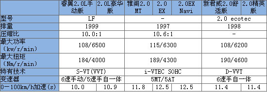 从上表的数值来看,雅阁2.0在最大功率方面占有优势,达到了115千瓦。新君威则凭借190牛米的最大扭矩以微略优势超过了雅阁。睿翼2.0的发动机最大扭矩则仅在4000转即可出现,加速性能突出。在表中“0-100km/h加速(s)”项目我们也能看到,睿翼2.0手动的0至100公里加速仅需要10秒,雅阁,新君威则最少需要11秒。