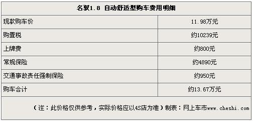 经销商表示名驭新车第一年全险的价格在5000元上下。以1.8 自动舒适型为例,优惠后全包价格大约为13.67万元,包含购置税、保险、上牌费等费用。