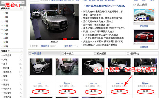 同样道理,在点击《新浪汽车2009广州车展网上展厅展台页》同样在右侧点击“投票”按钮对展台下的车型进行投票。