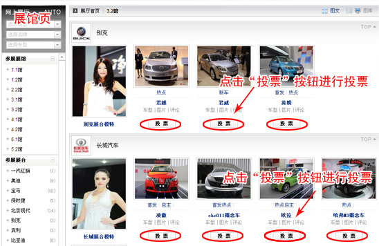 点击进入《新浪汽车2009广州车展网上展厅》,然后进入各展馆页面,在页面右侧的各展台下,可以清晰看到在每一款车型下面都会有明显的“投票”键。