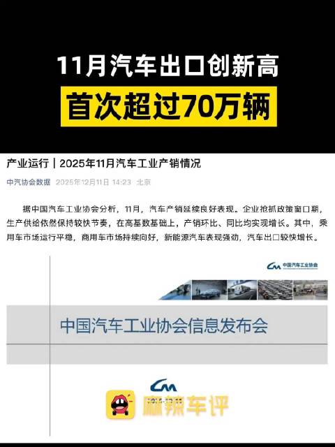 11月汽车出口首破70万辆,新能源车增2.6倍