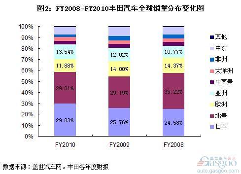 一、尽管北美市场在丰田集团销量中的占比连续三年出现了下滑,但截至2010财年(2010年3月31日结束)北美仍是丰田的第一大海外市场,占丰田集团总销量接近三成。北美地区对于丰田的重要性不言而喻。同时,丰田过于倚重北美市场也存在一定经营风险。从上图可以看出2009财年丰田北美地区销量占比同比大幅下滑,其中重要原因就是美国市场受经济危机冲击,导致需求骤减。