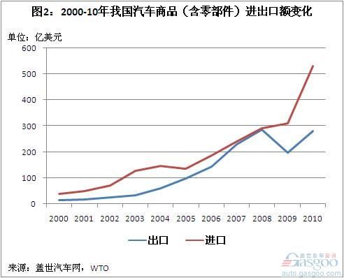 2000年,我国汽车商品进、出口总额分别为37.98亿美元和15.81亿美元,分别仅占我国进、出口总额的1.69%和0.63%。之后汽车商品贸易额总体呈上升趋势(除了2009年),2010年汽车商品进、出口总额分别达到530.43亿美元和280.37亿美元。