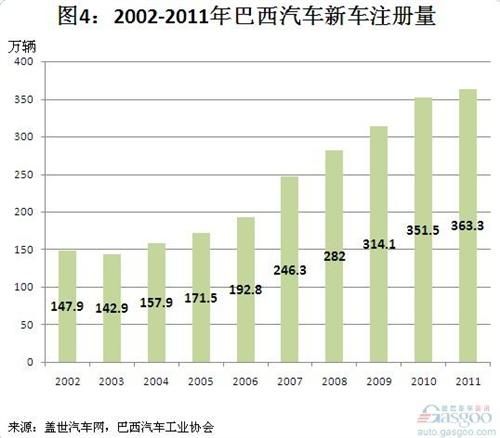 从2010年开始,巴西就已超越德国,成为全球第四大汽车市场。2011年,巴西汽车销量(指新车注册量)为363.3万辆,仅次于中国、美国和日本。