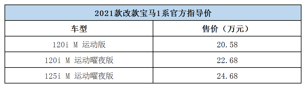 4月20日,华晨宝马官方宣布2021款改款宝马1系(配置|询价)正式上市。新车共推出3款车型,售价区间为20.58-24.68万元。