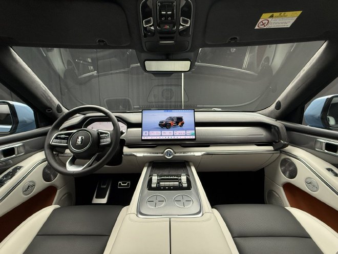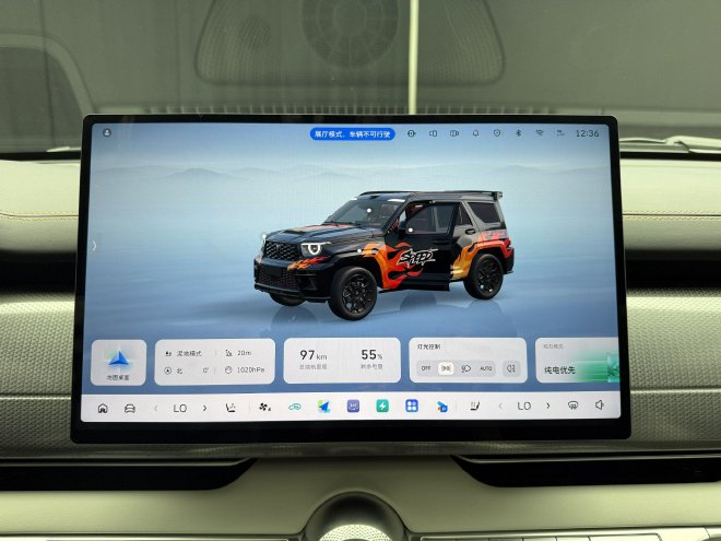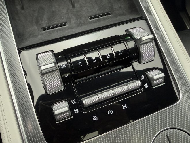 中央滑轨区域是这款车的硬核所在,例如越野模式、差速锁、低速四驱、坦克掉头等等按键都布局于此。物理按键的设计,也让使用者在越野时能够更方便、更安全的去设置所需功能。后方还带有座椅加热通风、能源模式等切换按键。