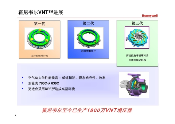 本霍尼韦尔VNT涡轮增压器为2004年推出的第三代VNT的升级版本。最主要的改进就是通过弹性护罩,将可变机构装到轴承座上的突破性方式。这一新平台带来了许多创新——新的芯座设计、新型弧形叶片、新一代涡轮叶片、空气动力设计的改善和可控性的提高。