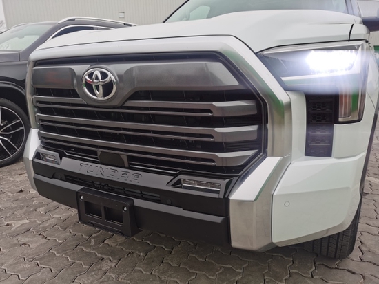 丰田坦途直接提供了有棱有角的车头前脸,大尺寸蜂窝状进气中网搭配镀铬边框处理,两侧泪痕造型LED矩阵大灯视觉效果并不输给福特猛禽。车身侧面看也有了方盒子外观效果,甚至还要熏黑车窗立柱营造出悬浮车顶。黑武士改装风格轮毂搭配原厂越野轮胎,素车就能够实现不错的越野通过性。