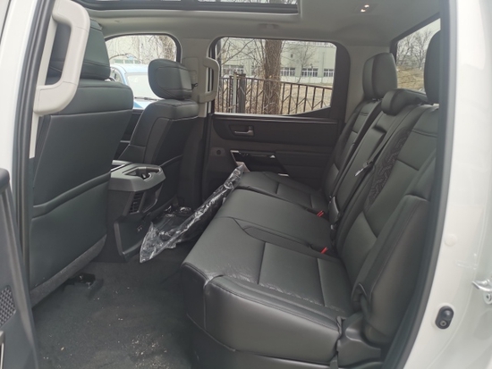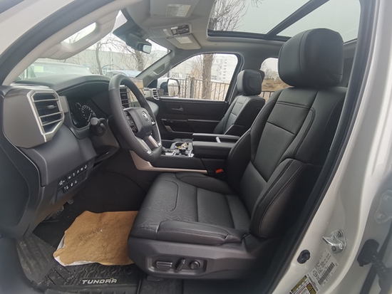 丰田坦途座椅提供有皮质包裹,整体的造型也非常宽大,在中央扶手区域的设计上也采用了非常方正的造型设计,并且可以看到前排的储物空间设计还是非常丰富的。