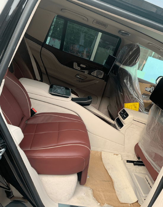 前排介绍就这么多,因为我要重点介绍后排,毕竟那才是这辆车的“卖点”所在。首先可以看到的是后排与奔驰GLS最大的区别就是采用了两张独立行政级座椅的设计,相比较五座车型后排的舒适性可想而知。