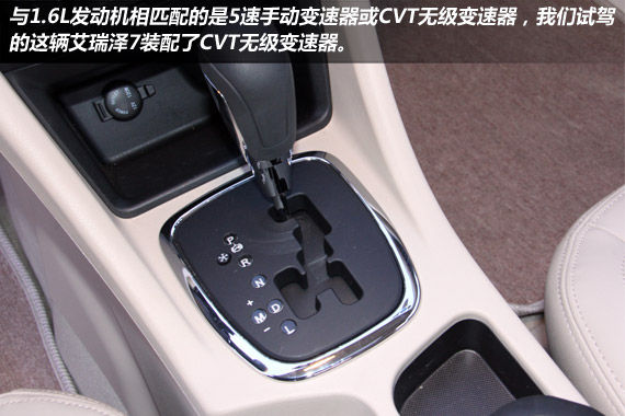 我们试驾的这辆艾瑞泽7装配了CVT无级变速器,并且带有手动模式。CVT变速器最大的好处就是平顺,因此日常驾驶的时候不用担心会有太强的顿挫感,可以非常好的满足舒适性的要求。CVT变速器与生俱来就有着传动效率低的弊病,因此在急加速方面的表现并不是特别令人满意。