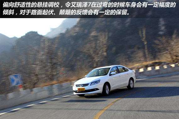 艾瑞泽7的悬挂整体偏向于舒适性,对于路面颠簸和起伏过滤的较为充分,同时还能将路感通过方向盘和座椅部分传递给驾驶者,在过弯的时候悬挂的侧向支撑有一定的韧性,如果尝试用较高的车速去过弯的话,悬挂对于车身侧向支撑会显得有些缺乏。
