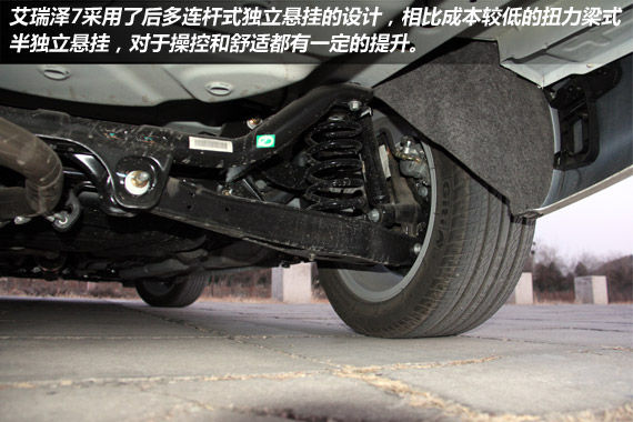 艾瑞泽7采用了这一级别车型比较常见的前麦弗逊式独立悬挂和后多连杆式独立悬挂的搭配组合,相比扭力梁式半独立悬挂,多连杆式独立悬挂对于提升舒适性和操控性都有非常显著的作用,作为艾瑞泽的开篇之作,艾瑞泽7采用这样的搭配也在情理之中。